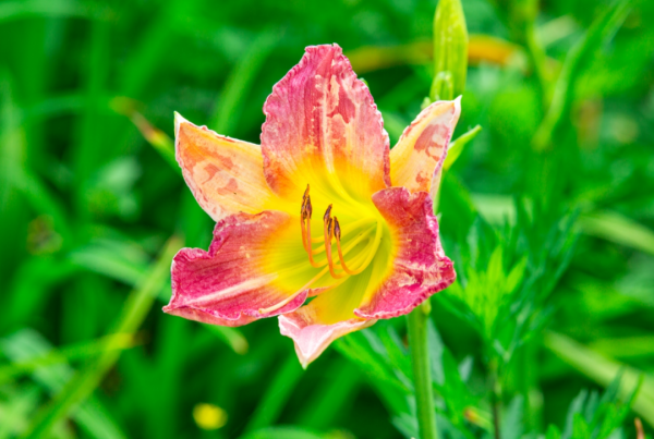 花粉色,花喉綠色,花邊緣淺粉色具有褶皺,中肋明顯,花徑8cm,花葶高40cm,花為早花期,半常綠品種。