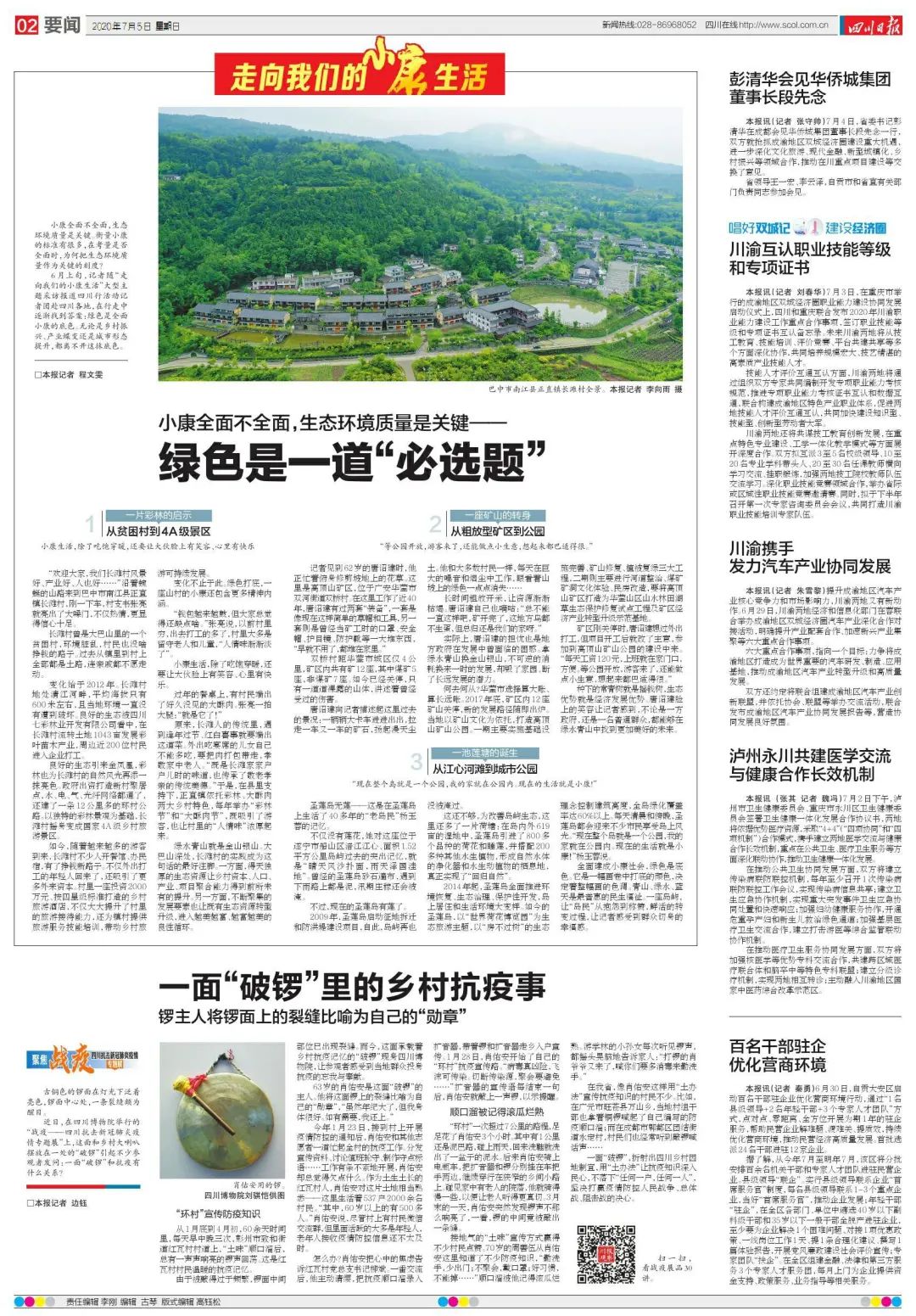 小康全面不全面,生態(tài)環(huán)境質(zhì)量是關(guān)鍵。衡量小康的標(biāo)準(zhǔn)有很多,在考量是否全面時(shí),為何把生態(tài)環(huán)境質(zhì)量作為關(guān)鍵的刻度?6月上旬,記者隨“走向我們的小康生活”大型主題采訪報(bào)道四川行活動(dòng)記者團(tuán)赴四川各地,在行走中逐漸找到答案:綠色是全面小康的底色。無論是鄉(xiāng)村振興、產(chǎn)業(yè)蝶變還是城市形態(tài)提升,都離不開這抹底色?!醣緢?bào)記者 程文雯